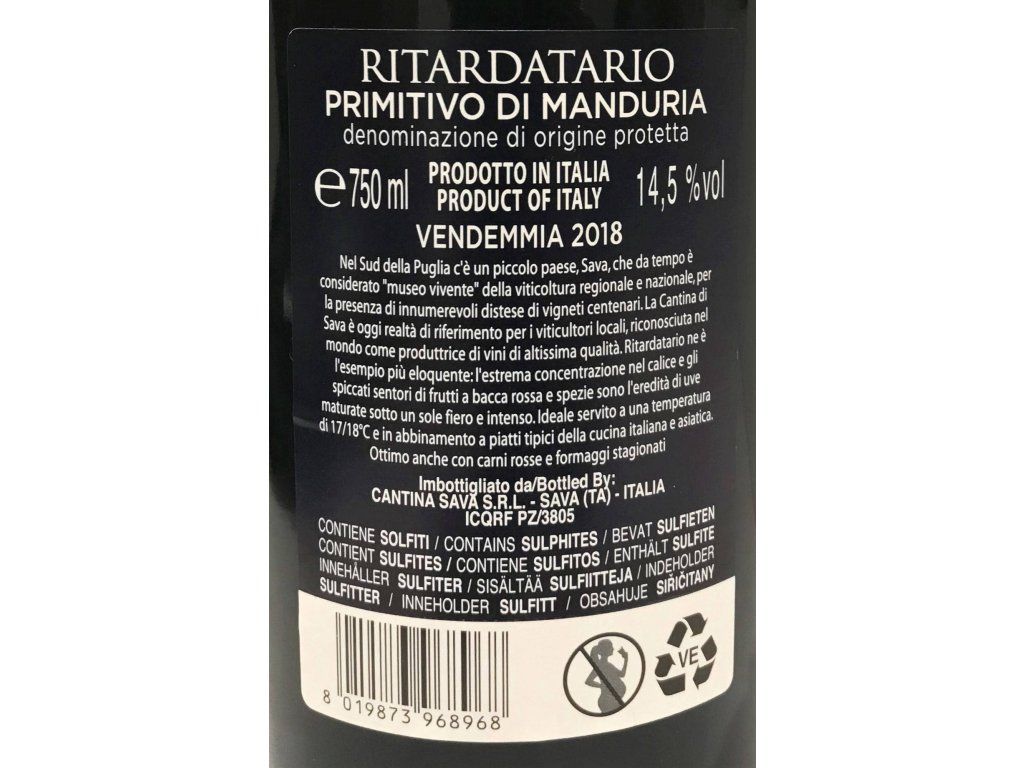 Ritardatario znamená „opožděný“ – a tady to dává smysl. Hrozny se nechávají na keři o něco déle, takže jsou plnější, sladší a výraznější. Výsledek? Temné, hladké a neskutečně voňavé červené, které má v sobě celou Itálii – od slunce po pomalá večerní jídla. Ve vůni se objevují zralé třešně, švestky, čokoláda a jemné koření, v chuti je víno bohaté, sametové a krásně vyvážené. Má středně plné až plné tělo, hladké třísloviny a dlouhý, šťavnatý závěr. Přes svou sílu působí elegantně – nepřehání to, prostě si užívá vlastní tempo. Skvěle doprovodí grilované maso, lasagne, hovězí ragú nebo vyzrálé sýry. Víno, které nepotřebuje vysvětlovat – stačí nalít a pochopíte, proč má Primitivo tolik fanoušků.