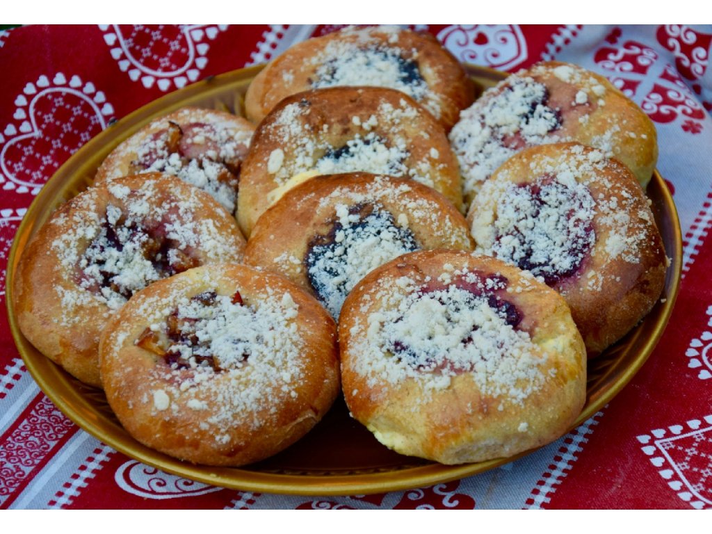 Tradiční koláč z Hané z dlouho-kynoucího těsta (mix pšeničné, špaldové a pohankové mouky) s tvarohovou náplní, s marmeládou nebo s povidly (dle sezóny možné i s ovocem) a s drobenkou.