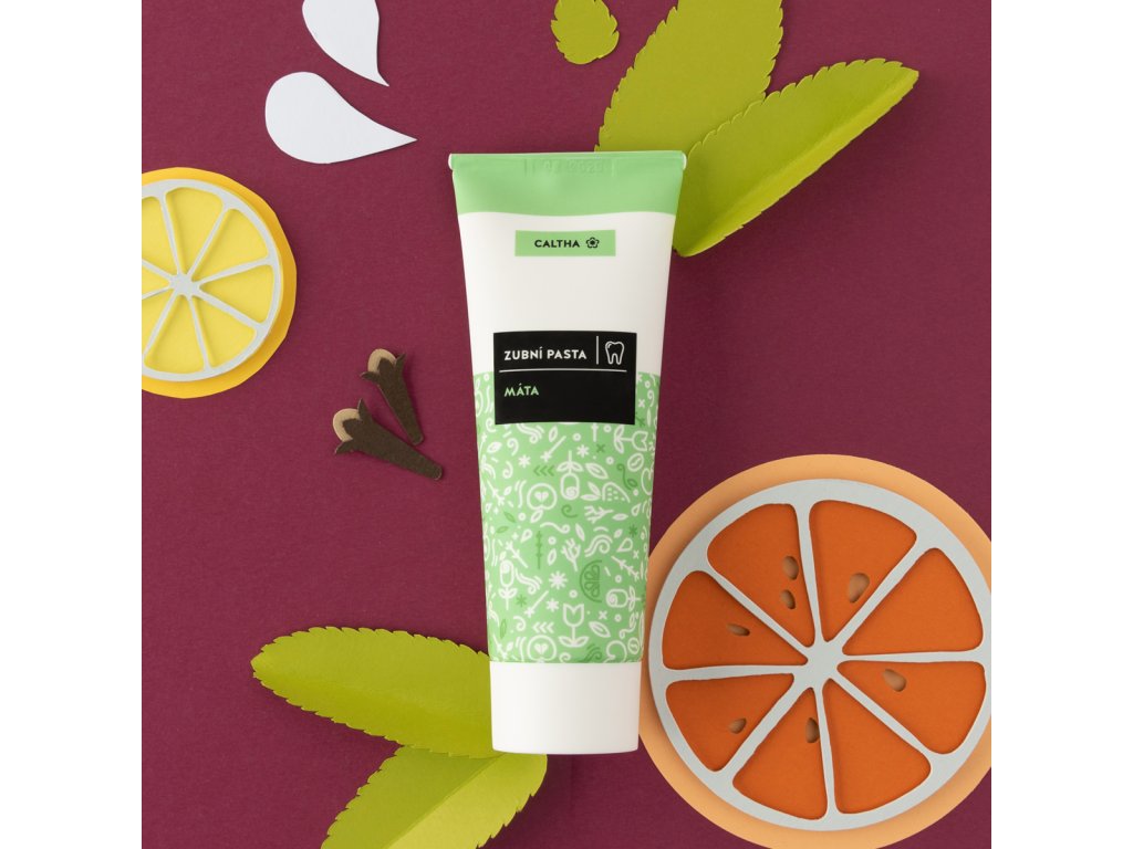 Zubní pasta MÁTA spojuje silný, osvěžující účinek máty peprné s jemností máty kadeřavé. Doplňují je pomeranč, citron a hřebíček, které podporují bělicí a antibakteriální účinek pasty a zároveň jí dodávají vyváženou svěží chuť. Základ pasty tvoří křemelina a uhličitan vápenatý, které jemně čistí zuby, mechanicky odstraňují povlak a posilují sklovinu. Kokosový olej působí antibakteriálně a bělicí, zatímco xylitol paradoxně díky své sladké chuti pomáhá v prevenci proti zubnímu kazu. Přírodní složení je navrženo tak, aby nedráždilo dásně a chránilo sklovinu i při každodenním používání.
